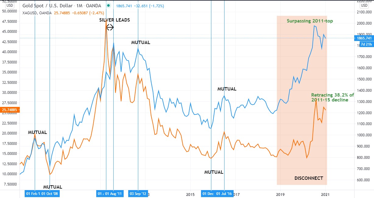 Silver's 2020 high (see chart above) was close to $30. However, this did not surpass its previous record high in 2011 of almost $50 per ounce. Something is amiss...