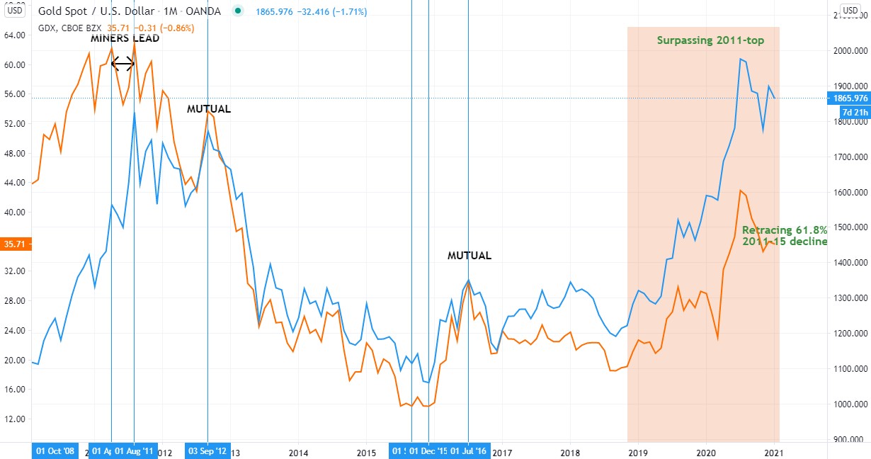 One more piece of evidence! The miners (GDX ETF above in red) usually outperform gold (blue line) in bull markets as well. But again, just like silver, the GDX is under performing.